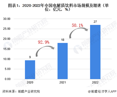 报告显示,2022年电解质饮料市场规模同比增长50.1%,达27亿元。这让电解质饮料一跃成为2022年国内饮料行业市场规模同比增速最高的饮品类别。